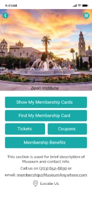 Card in the App updates itself after renewals Get membership benefits info within the app. Get info on reciprocal benefits at other museums that are included in your membership. See what additional benefits you can get if you upgrade to another membership type. Get answers to Frequently Asked Questions Google map integrated to find live directions to the museum. Touch to call the Membership staff. Quick email to Membership staff