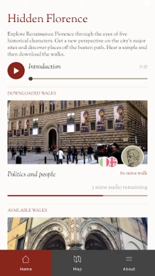 You can use this app as you move through the streets of Florence and trigger stories with GPS - or - sit back and let your fingers do the walking by tapping on story points.