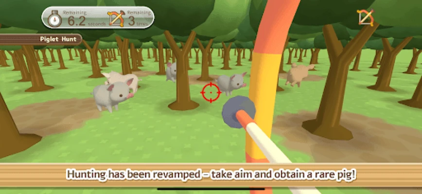 Have a shot at the Piglet Hunt with a Hunt Ticket. Get new types of pigs through hunts for piglets, using a bow and arrow (with a suction cup attached)! Some pigs can only be obtained through hunts. Further, use a Rare Hunt Ticket to hunt for only rare pigs!