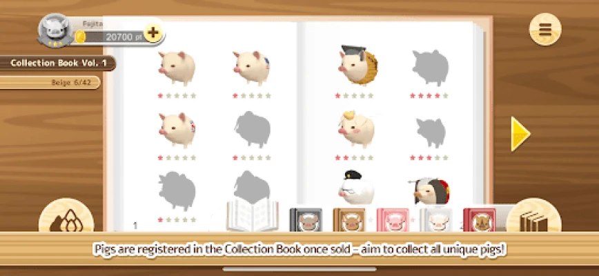 Pigs you raise are recorded in your Collection Book. You can see the details of the pig, such as its characteristics and raising requirements. There are 6 volumes in total for each color type. Also check out the Breeding Chart in the Collection Book, which is sure to come in handy when breeding. Will you be able to complete all pages?